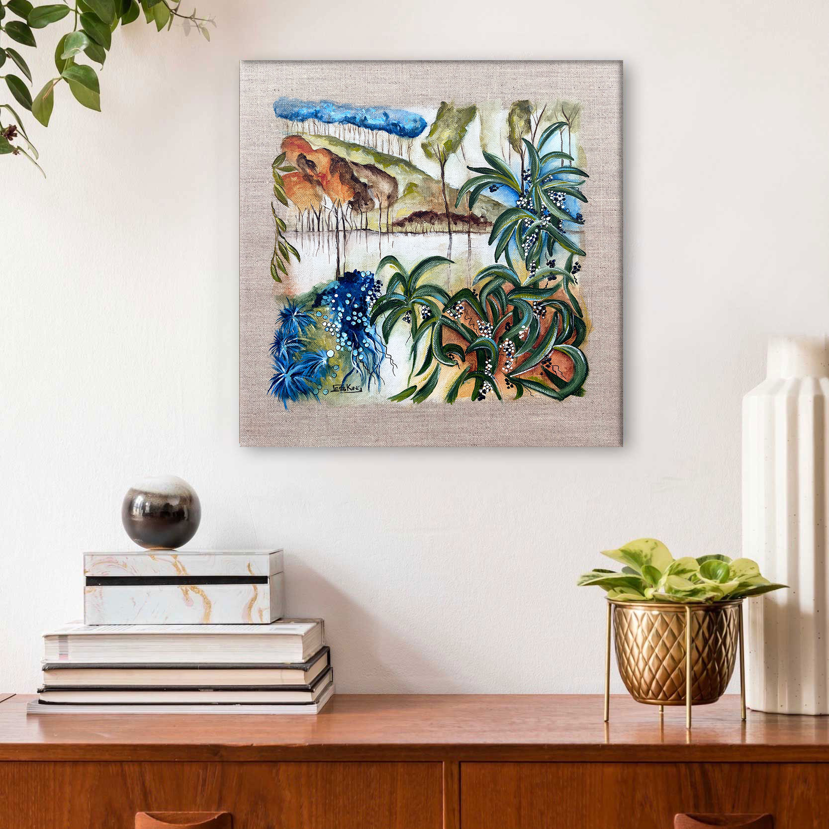 “Aussie Bush Beauties” original painting by Jess King of multi-colored trees on raw linen canvas. Framed and ready to hang.
