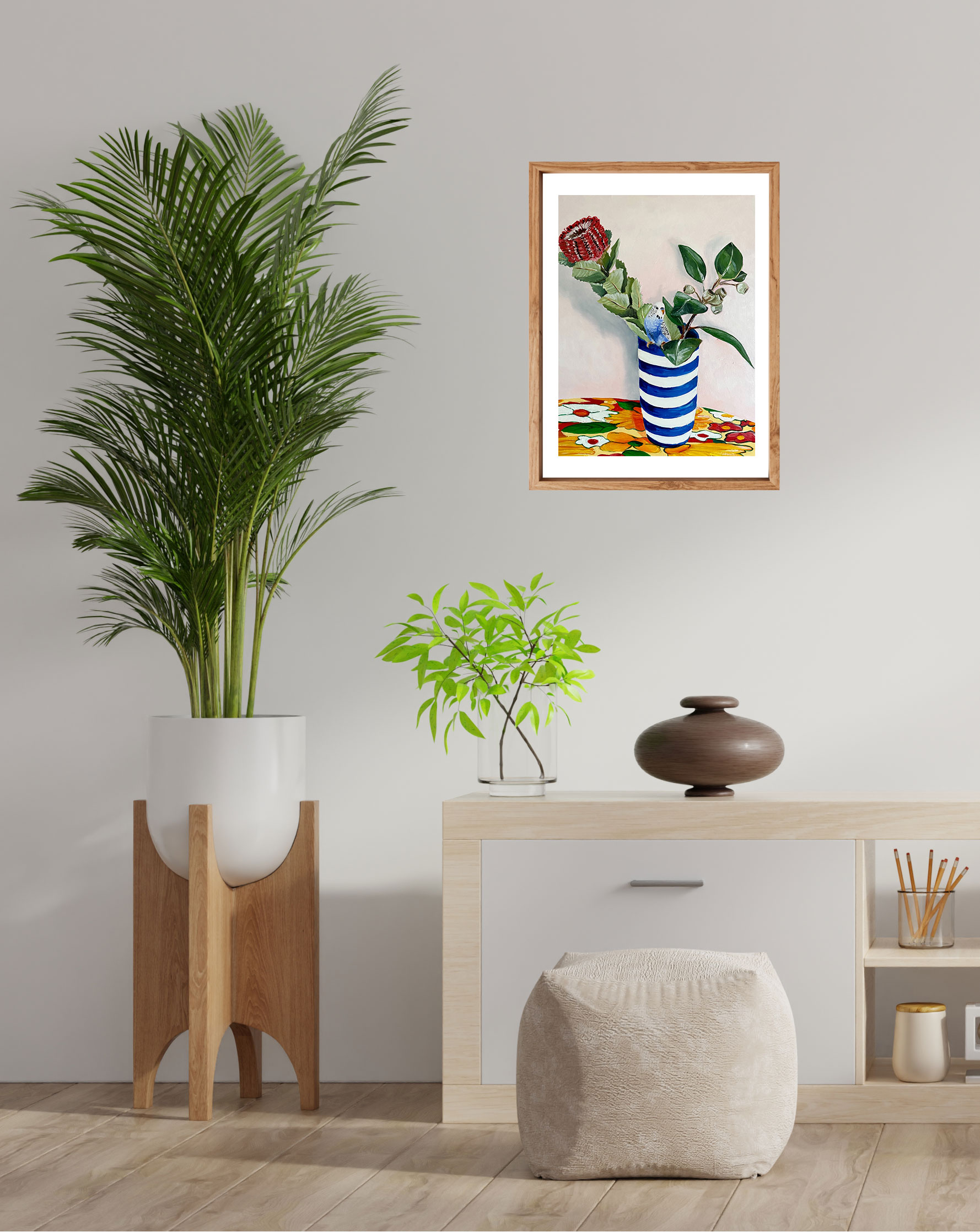Discover the perfect blend of Australian native beauty and coastal sophistication with this stunning “Banksia, Budgie, Hamptons Vase Still Life” Art Print. This exquisite composition brings together iconic Australian elements with elegant Hamptons styling, creating a unique piece that celebrates both our native heritage and timeless design aesthetics.