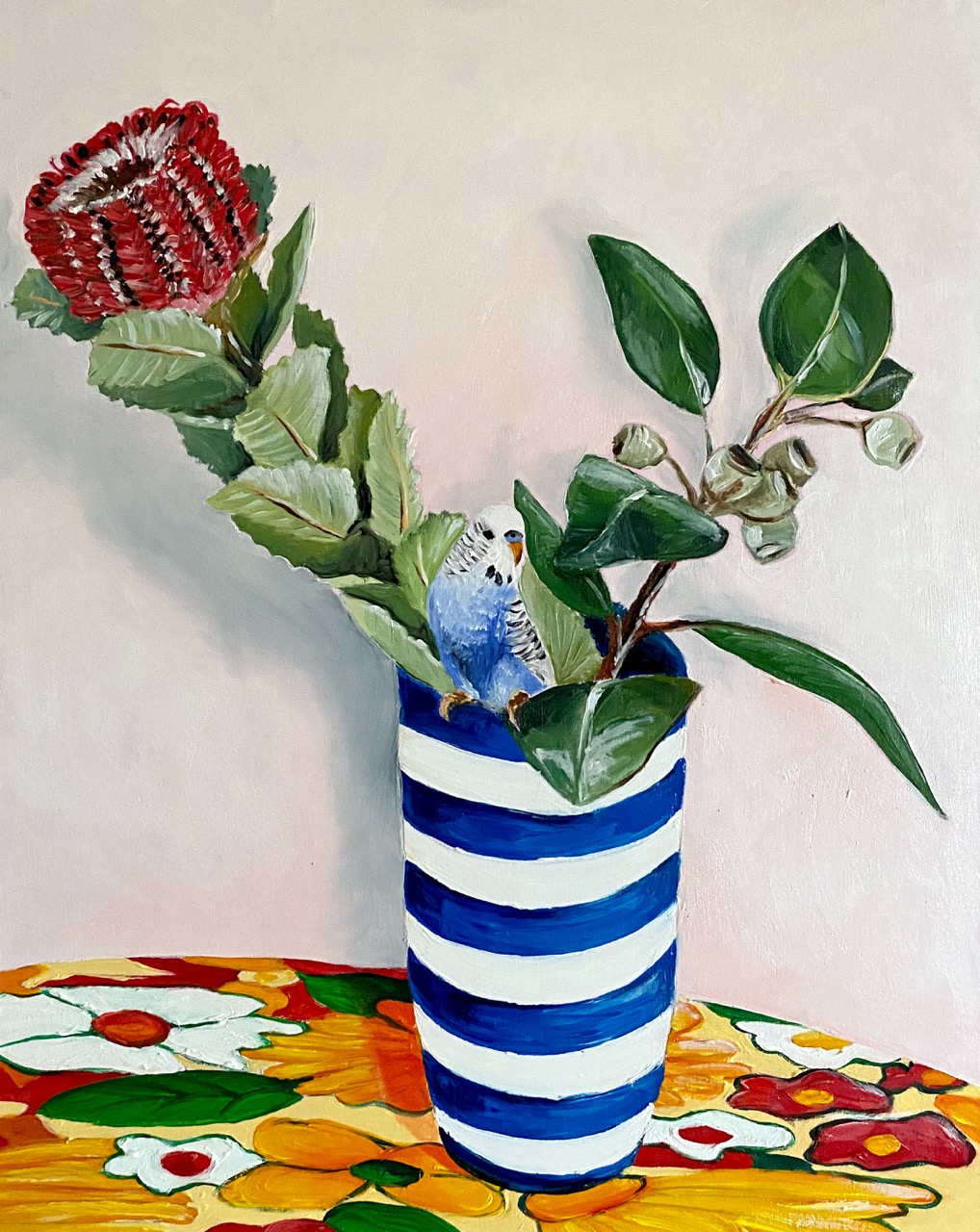 Banksia, Budgie, Hamptons Vase Still Life Art Print