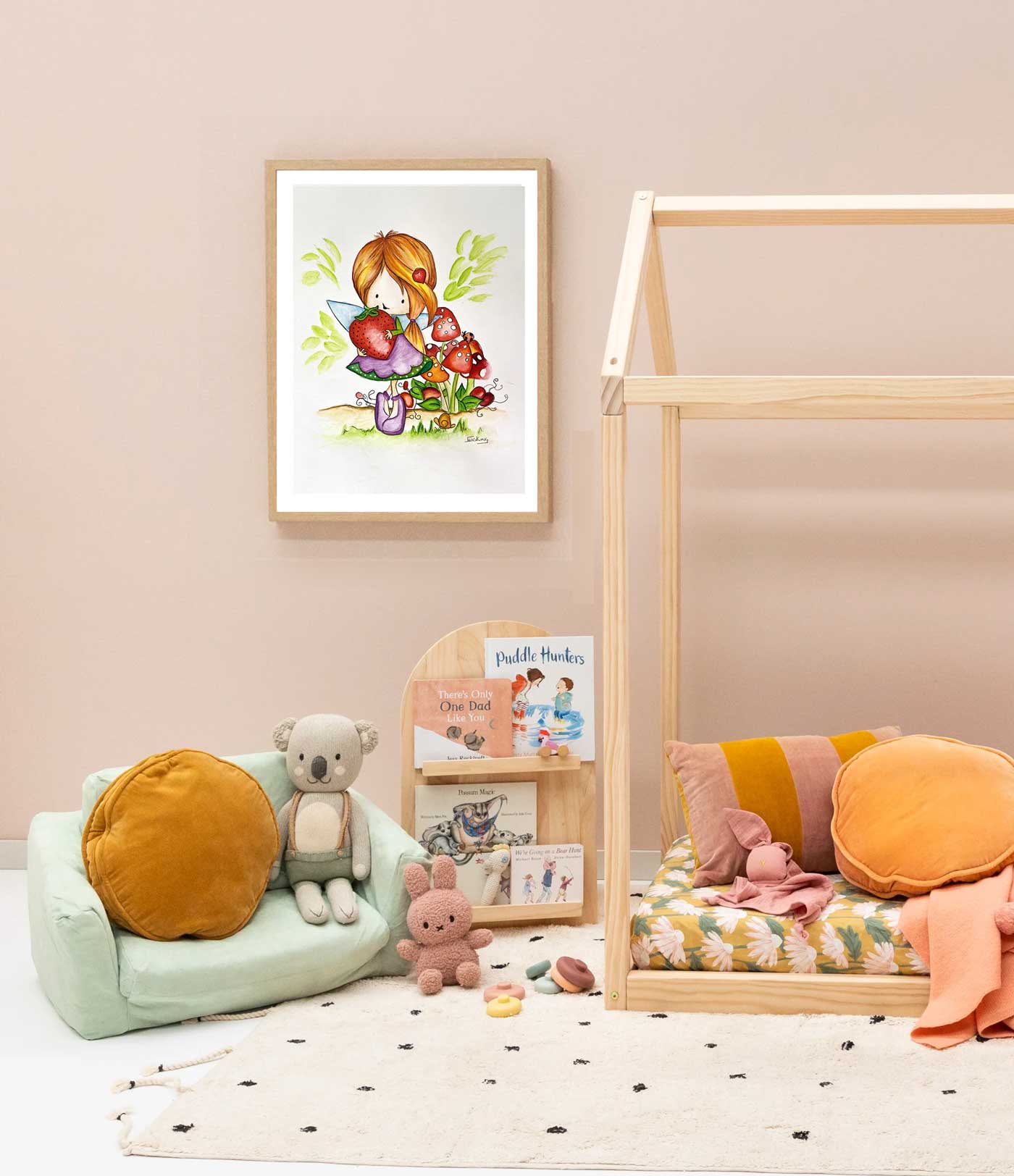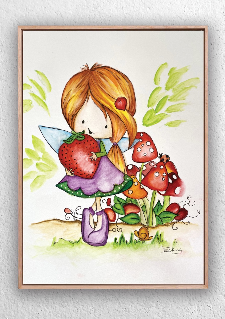 Enchant your little one’s world with this delightful “Berry Fairy” Art Print for Kids Room. This whimsical piece brings the magic of fairy gardens and sweet berry adventures into your child’s space, featuring an adorable fairy character surrounded by luscious berries that will inspire dreams of magical forest adventures.