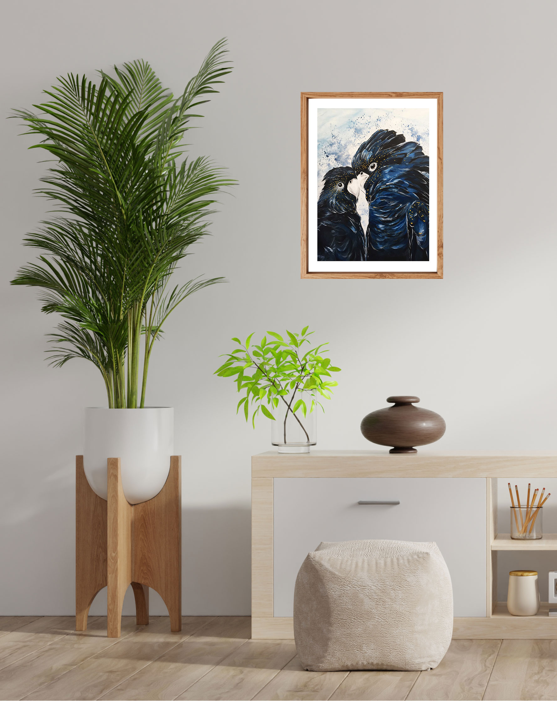 Fall in love with Australia’s iconic wildlife through this breathtaking “Black Cockatoo Love” Art Print. This captivating piece showcases the beauty and grace of these magnificent native birds, capturing their distinctive character and the deep connection they share with the Australian landscape.