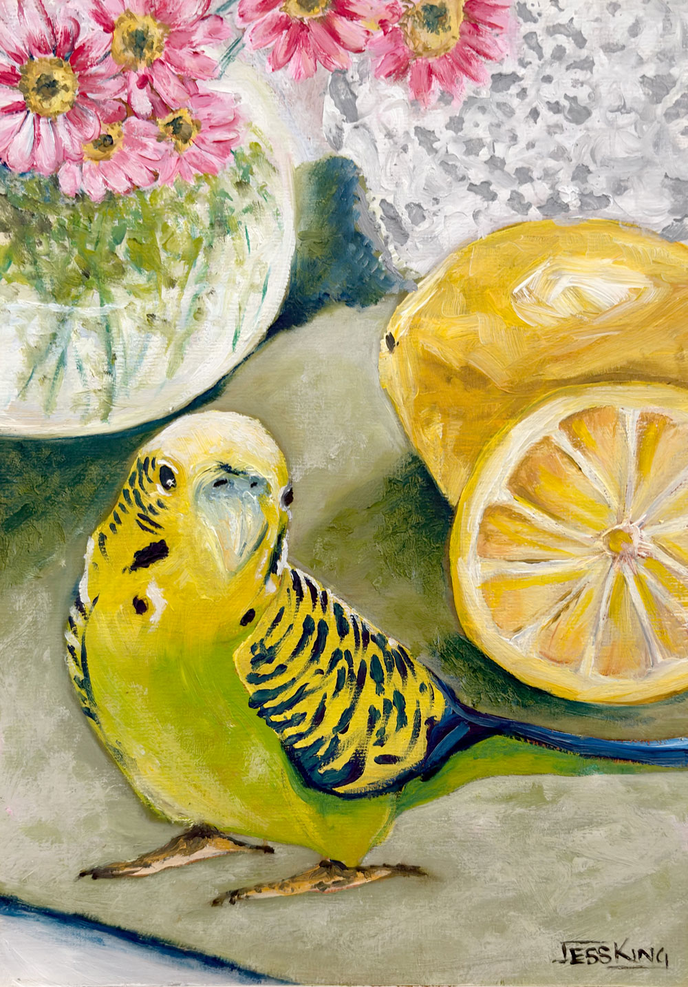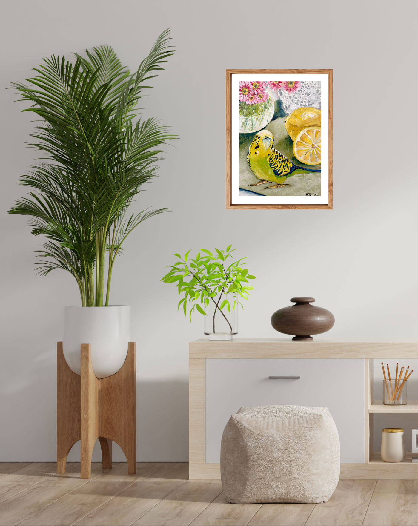 This playful art print captures the curious charm of a budgie swooning over vibrant lemons. Perfect for adding a splash of whimsy and a burst of sunshine to any room, it’s a delightful blend of nature’s cheeky personality and fresh citrus zest. Let this lively scene brighten your space with its quirky, joyful energy.
