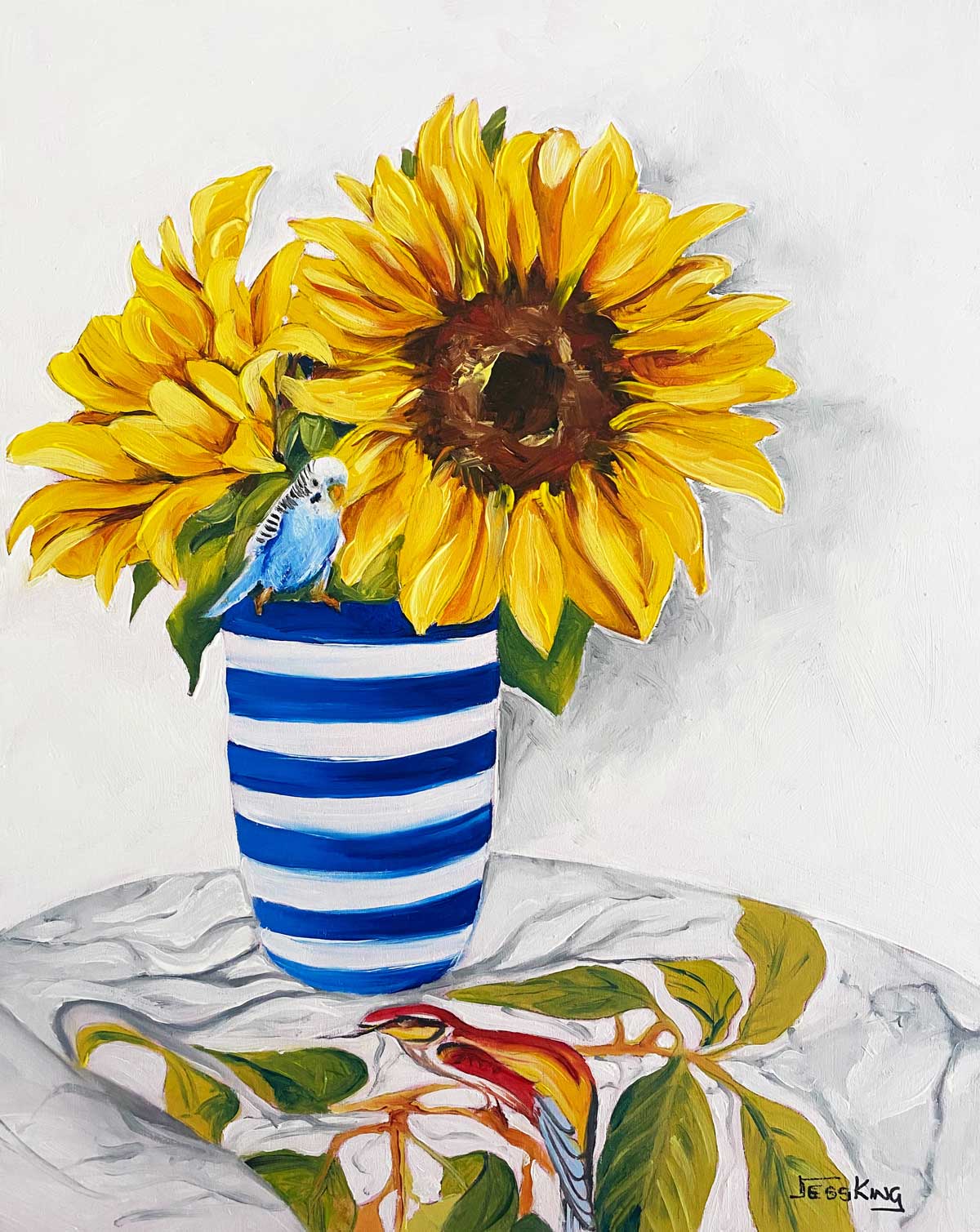 Celebrate cheerful moments with this lively art print featuring bright yellow sunflowers in a charming blue and white striped vase. Nestled on a cozy table cloth, a tiny blue budgie adds a delightful touch of personality, making the scene burst with playful charm and sunny vibes perfect for any room craving a happy glow.