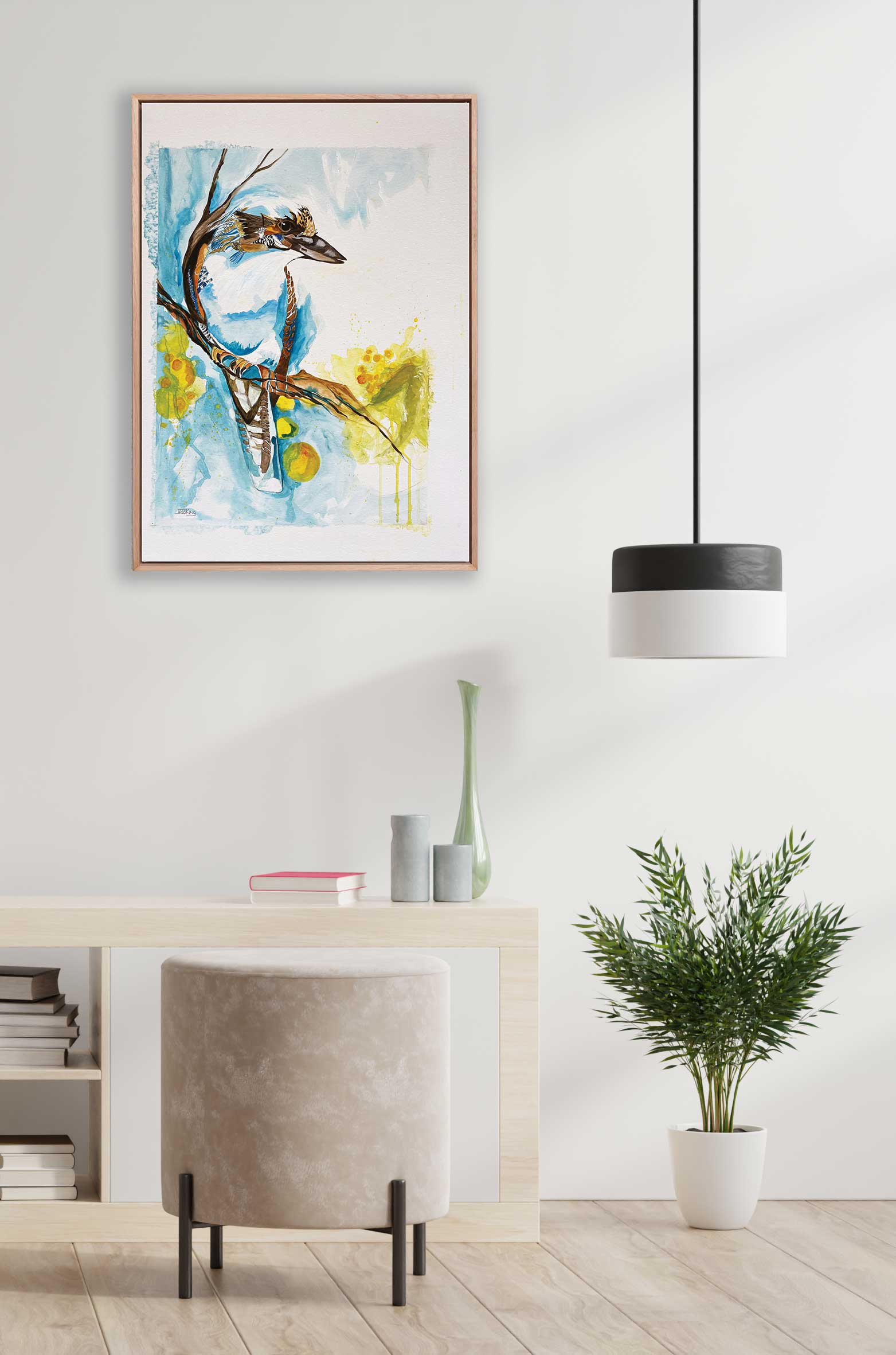 Immerse yourself in the vibrant beauty of native Australian wildlife with this stunning “Kookaburra Wattle” Art Print. This captivating piece captures the iconic kookaburra perched among golden wattle blossoms, celebrating the harmony between Australia’s beloved bird and national flower.
