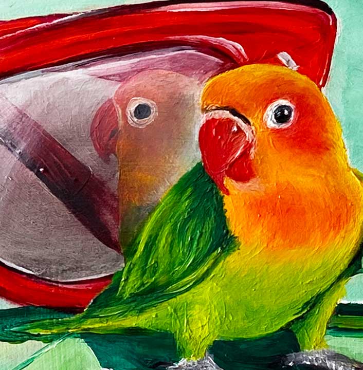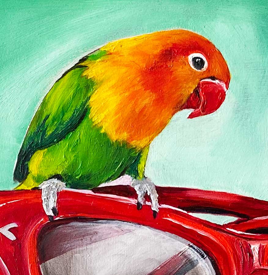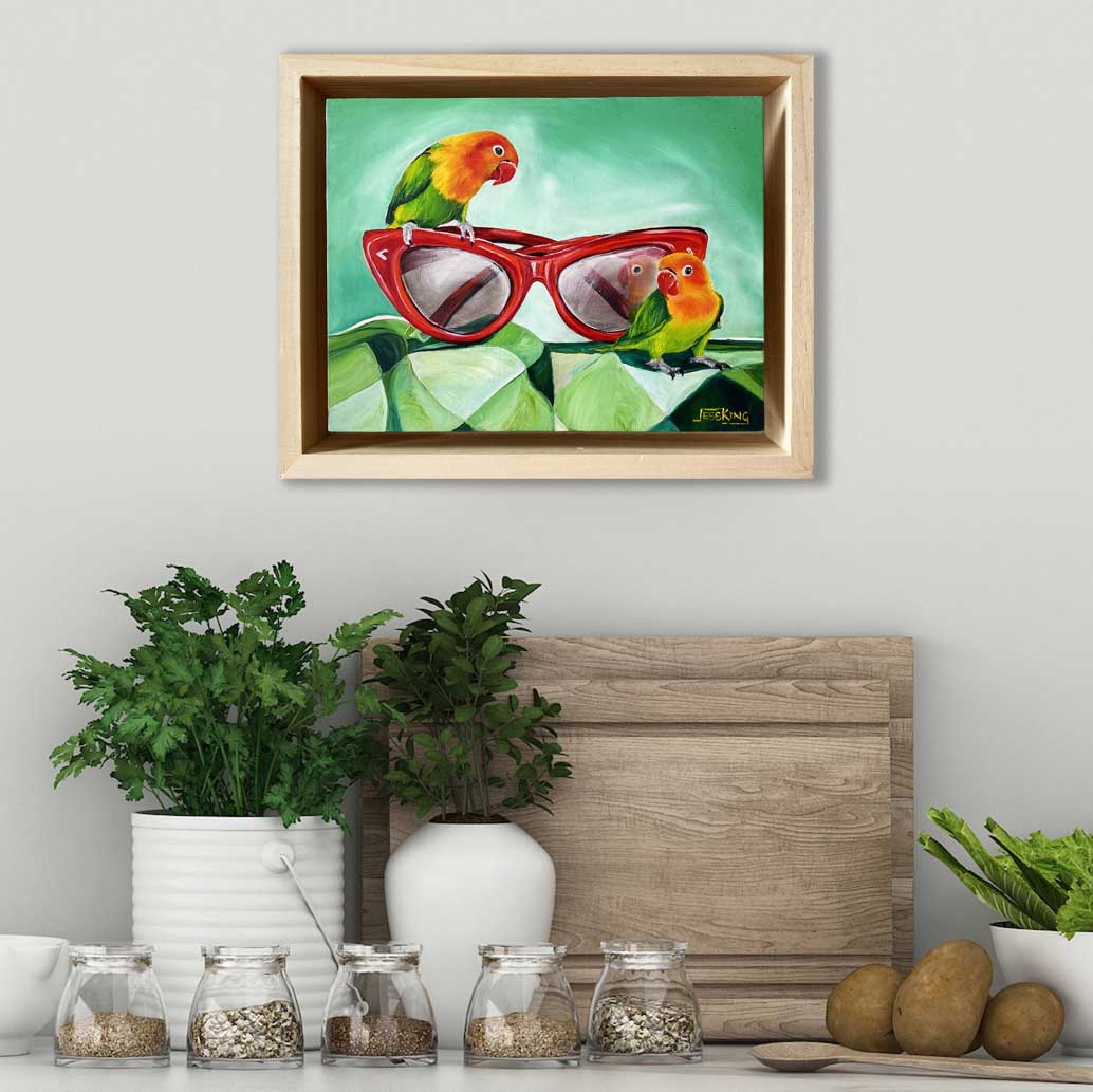 Two Fischer’s lovebirds perch on a pair of oversized red cat-eye sunglasses in this cheeky, sun-drenched original oil painting. One bird studies its own reflection in the tinted lens — preening, curious, entirely unbothered. Set against a breezy mint green background with a geometric green cloth below, Look at Me is playful and full of personality. A small-format work with enormous presence. Original oil on board, framed in a chunky natural timber floater frame.