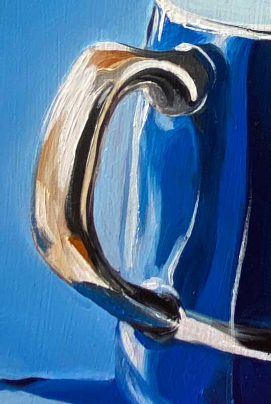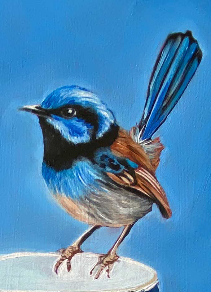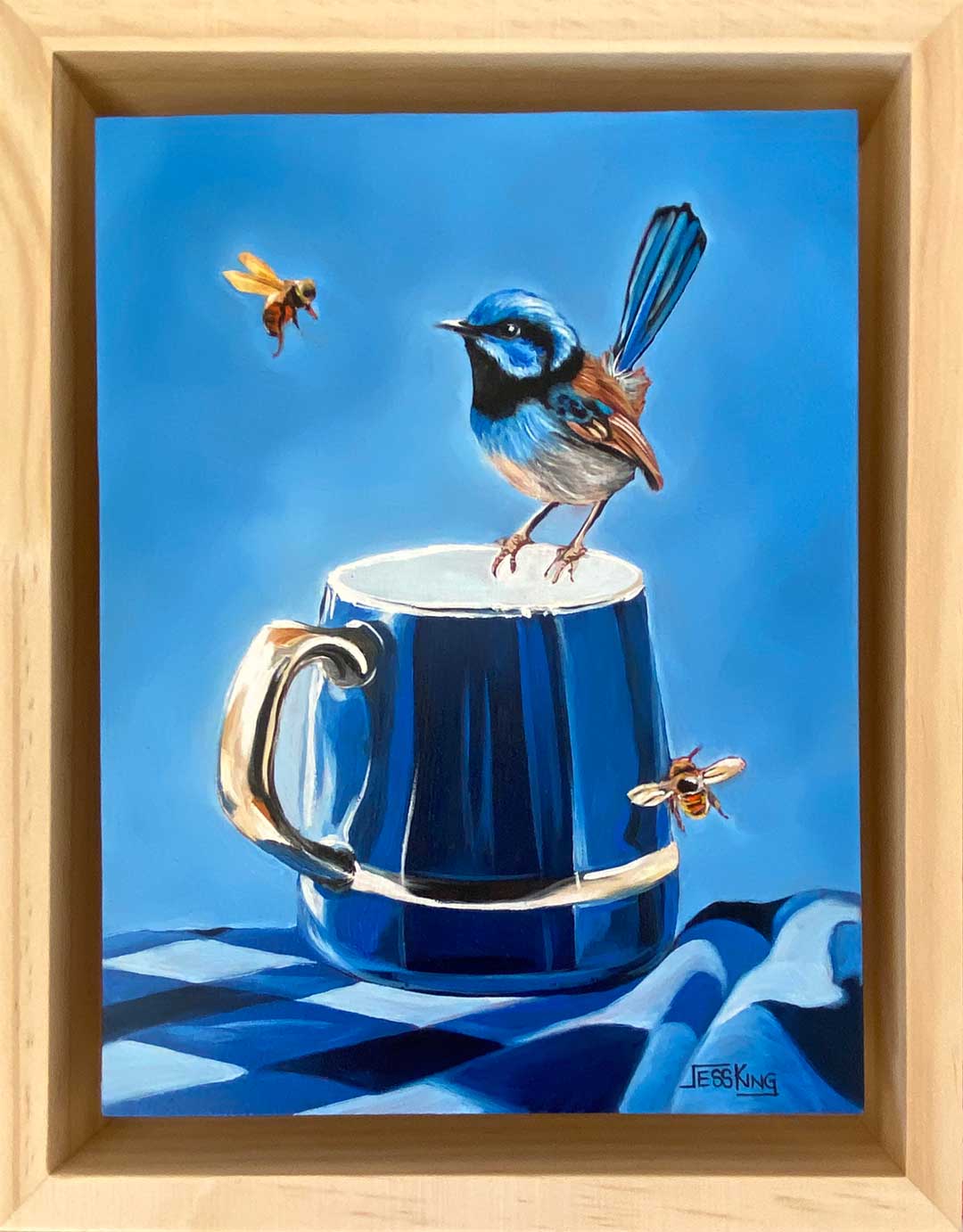 A superb fairywren perches on the rim of a glossy cobalt blue mug, tail cocked, entirely unbothered — while two honeybees orbit the scene with their own agenda. One Lump or Two is a painting about the small, absurd interruptions of a quiet morning. The deep navy of the mug echoes the wren’s own iridescent plumage, and the blue and white diamond cloth below ties the whole composition into something cohesive and joyful. Painted on board and framed in a chunky natural timber floater frame, this is a small-format work with real presence. Original oil on board.